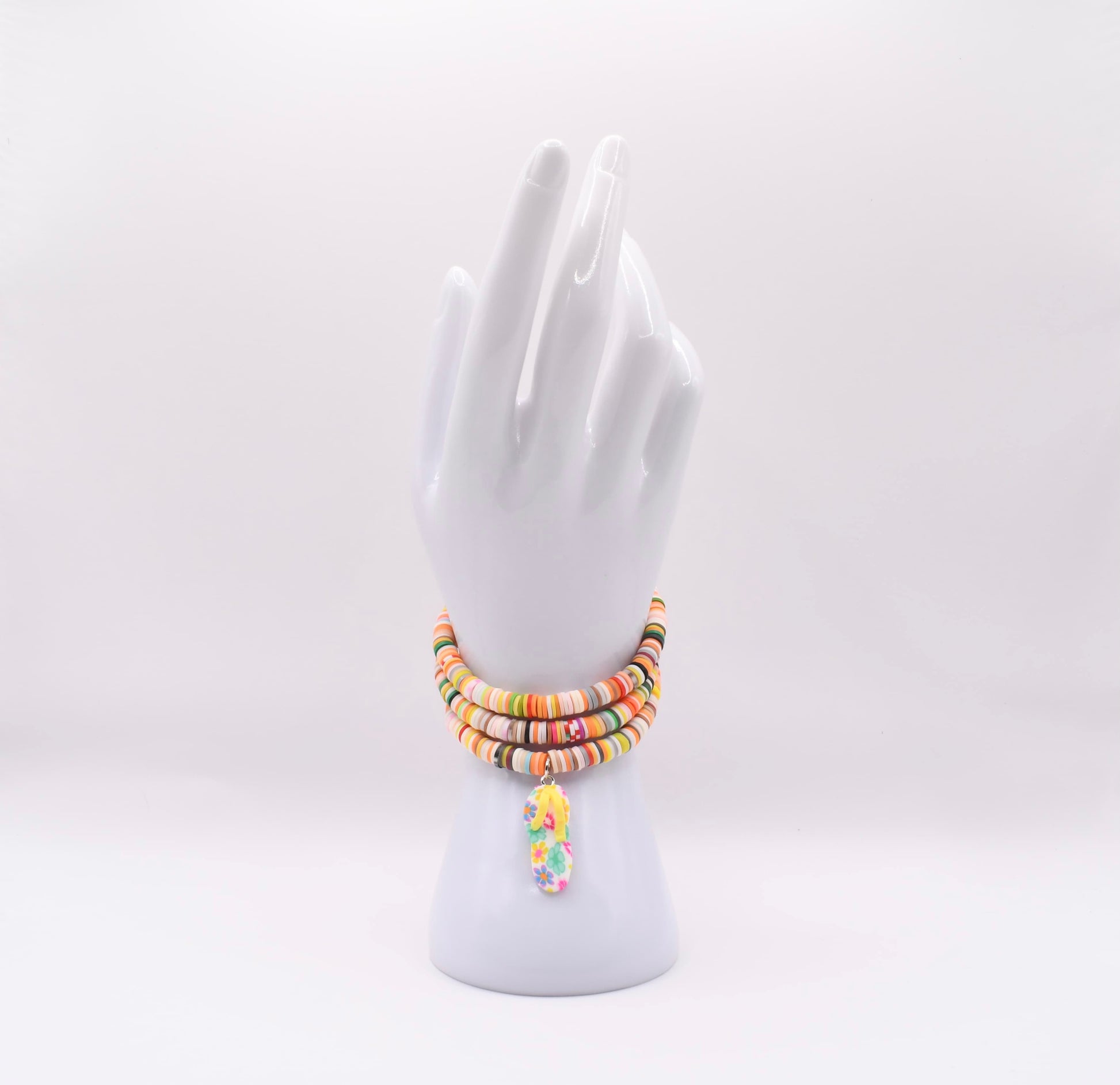 A cheerful blend of warm sunset shades wrapped together in soft heishi beads, finished with a bright floral flip-flop charm. This necklace brings the feeling of golden hours, sandy toes, and summer bliss wherever you go.