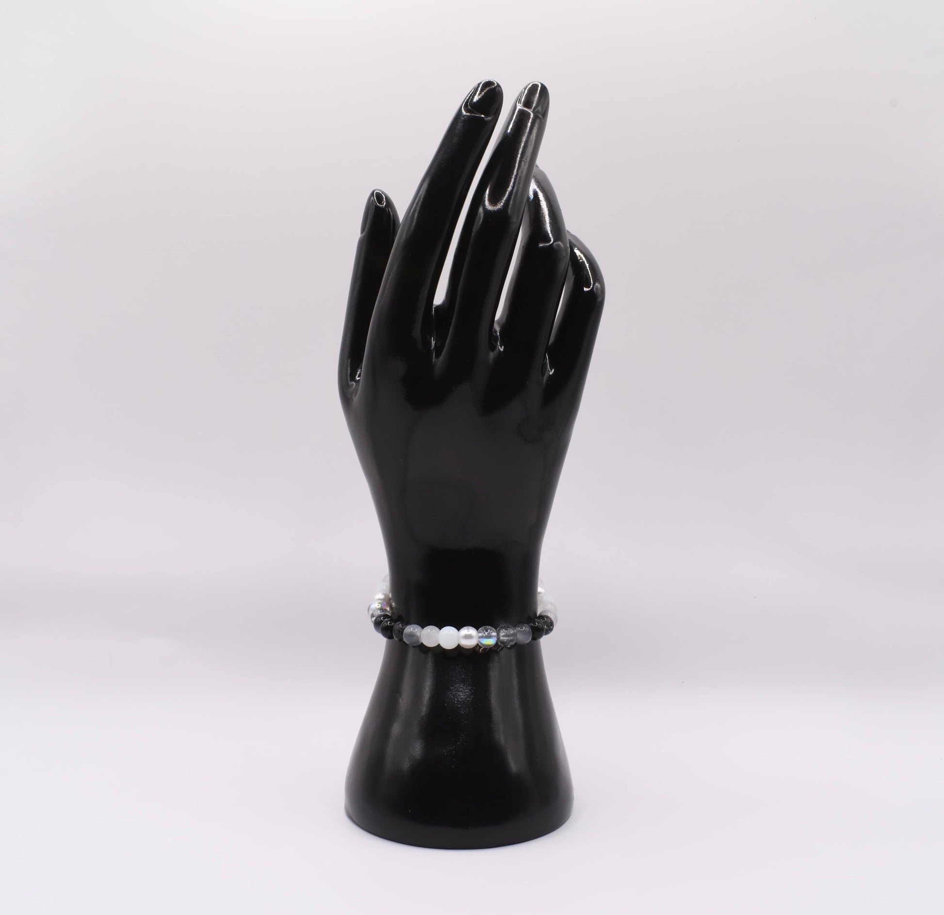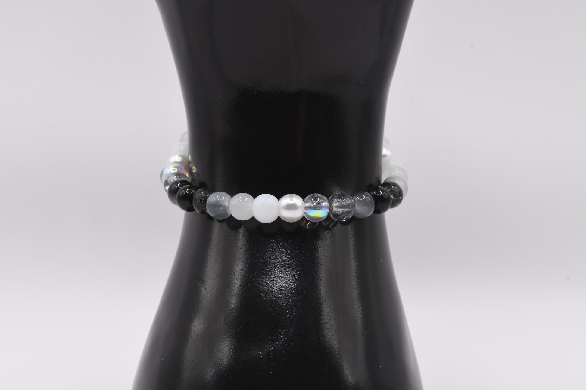 A graceful dance of soft white, smoky gray, and deep midnight tones, Moonlit Noir captures the quiet glow of the moon against a starlit sky. With subtle iridescent shimmer that catches the light, this bracelet feels both mysterious and refined—perfect for those who carry elegance effortlessly.