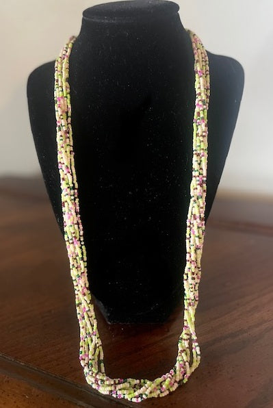This 14-inch necklace features multiple strands of vibrant seed beads, offering a rich blend of colors that enhance any outfit. Designed with a secure clasp, it ensures comfortable wear and easy fastening. Its multi-string design adds texture and depth, making it a versatile accessory for both casual and elegant styles.