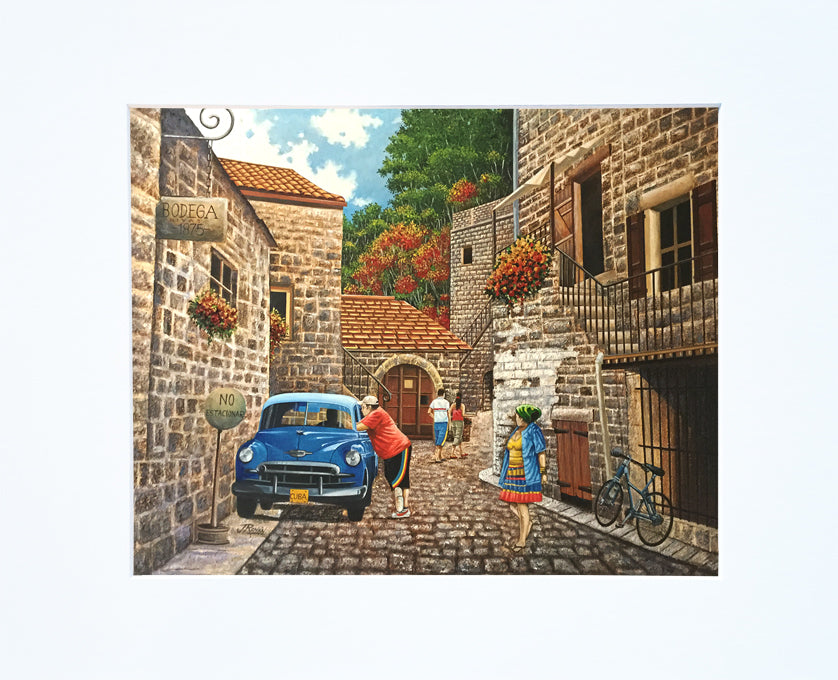 This "No Parking" print, sized at 7 1/2" by 9 1/2" and presented with an 11" x 14" mat, offers a captivating glimpse into everyday life in a small Cuban town. Expertly crafted, it balances artistic detail with cultural authenticity, making it a compelling piece for collectors and admirers of intimate Americana scenes. Its carefully chosen dimensions ensure it fits beautifully in various display settings, bringing vibrant street moments and local character into your space with subtle sophistication.
