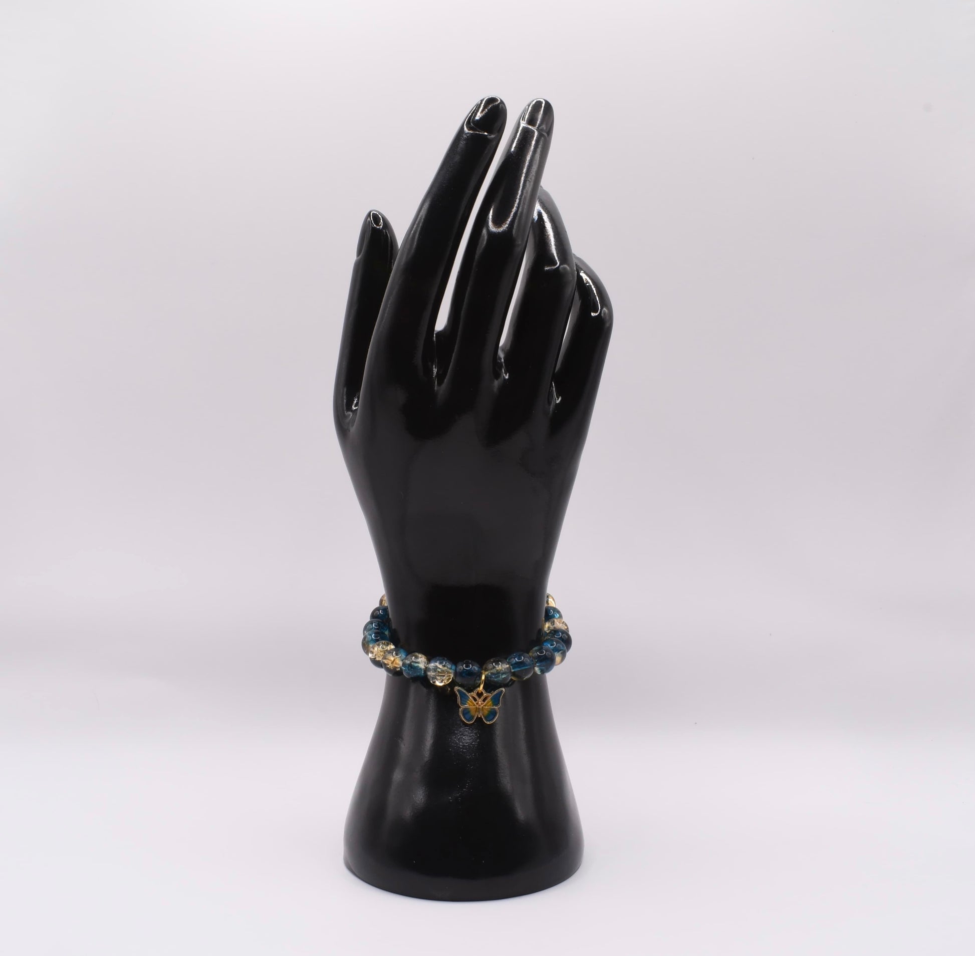 Crafted for elegance, the Northern Lights bracelet features 8 inches of hand-made light blue crackle glass beads, each capturing subtle depth and shimmer. Accented with a delicate butterfly charm, this piece offers a refined touch symbolizing transformation and grace. Perfect for those seeking a unique accessory that blends artistry with meaningful detail.