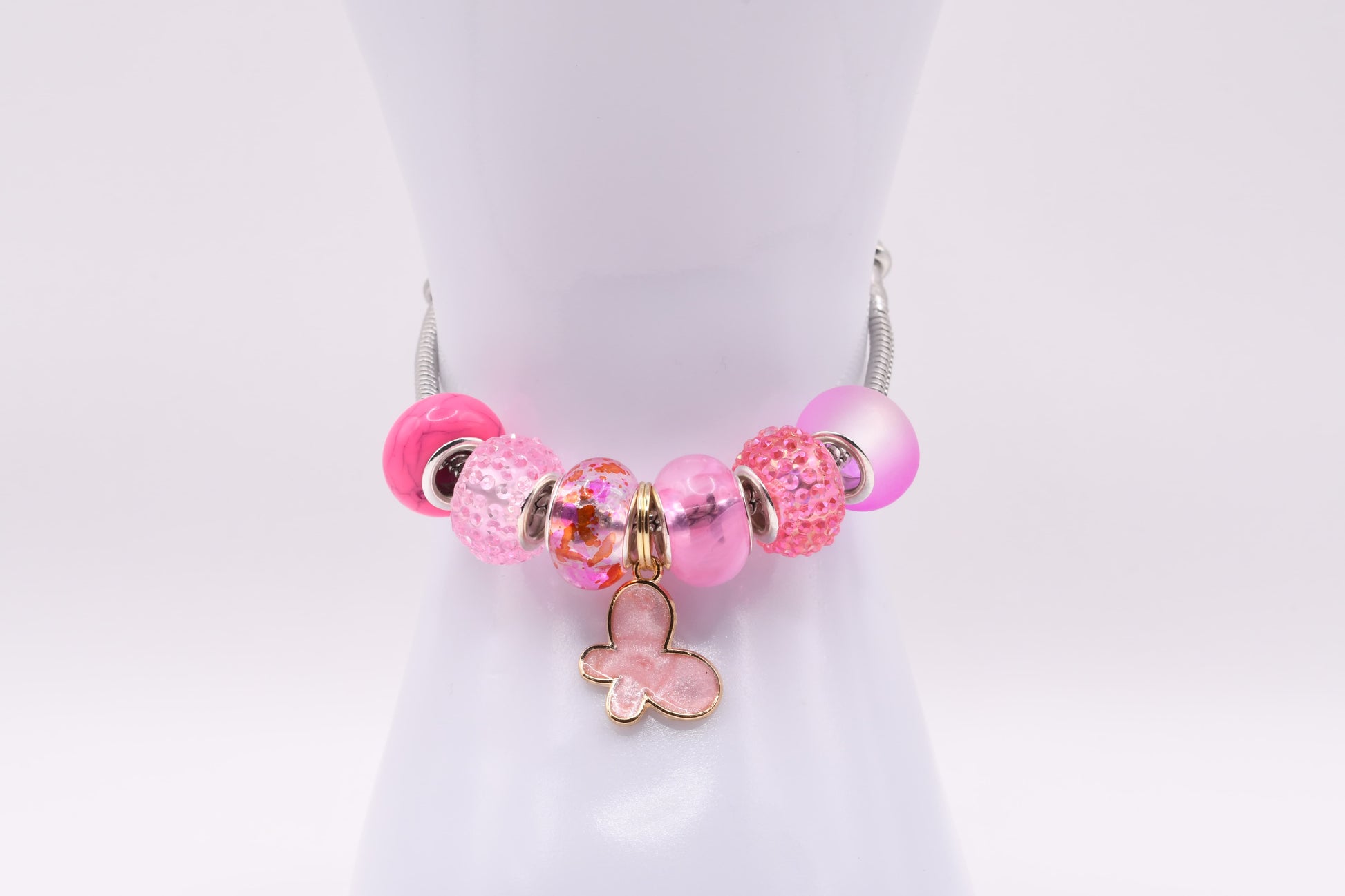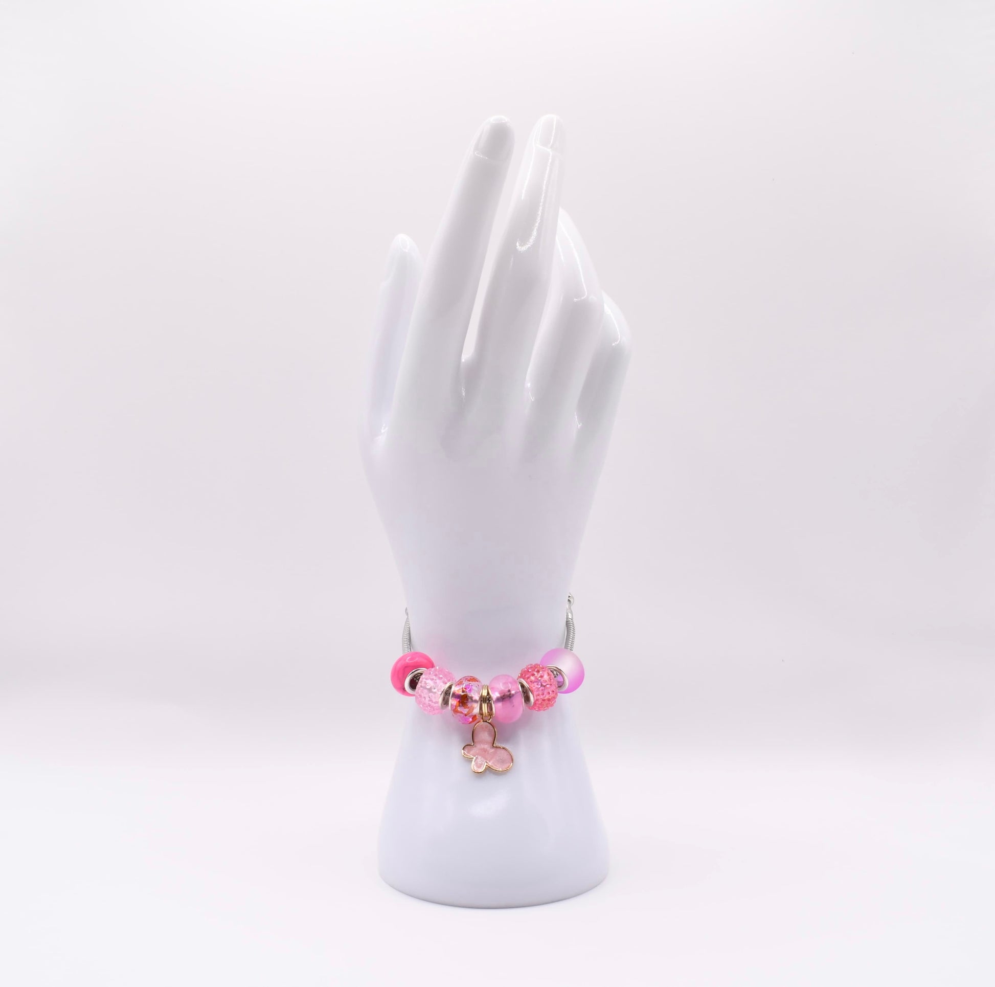 Delicate and dreamy, Rosy Flight captures the light-hearted beauty of a butterfly bloom. Shades of blush, rose, and petal pink come together in glimmering glass and textured beads, centered by a soft pink butterfly charm that symbolizes transformation and joy. This bracelet is a sweet reminder to embrace your own wings and let your spirit soar.