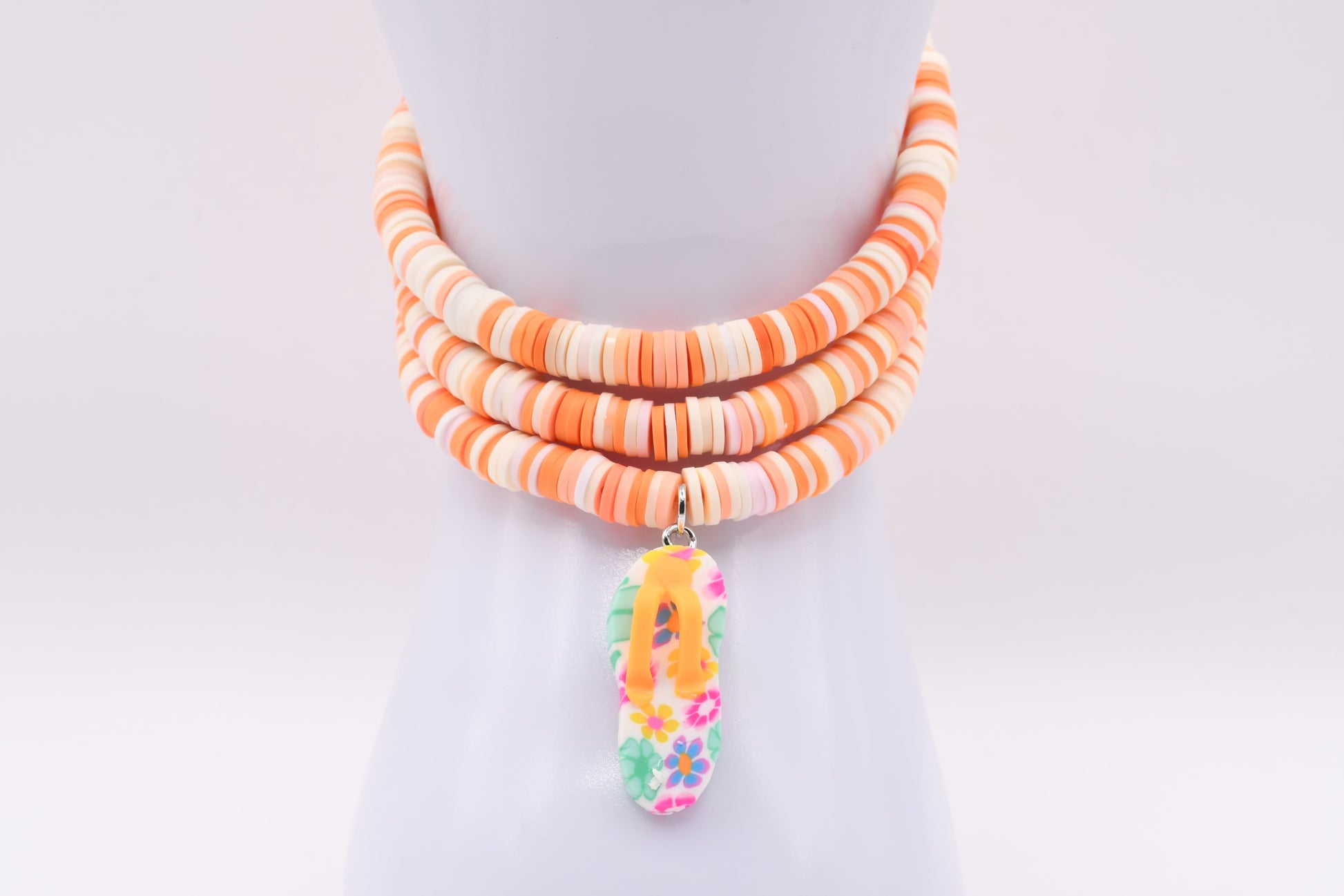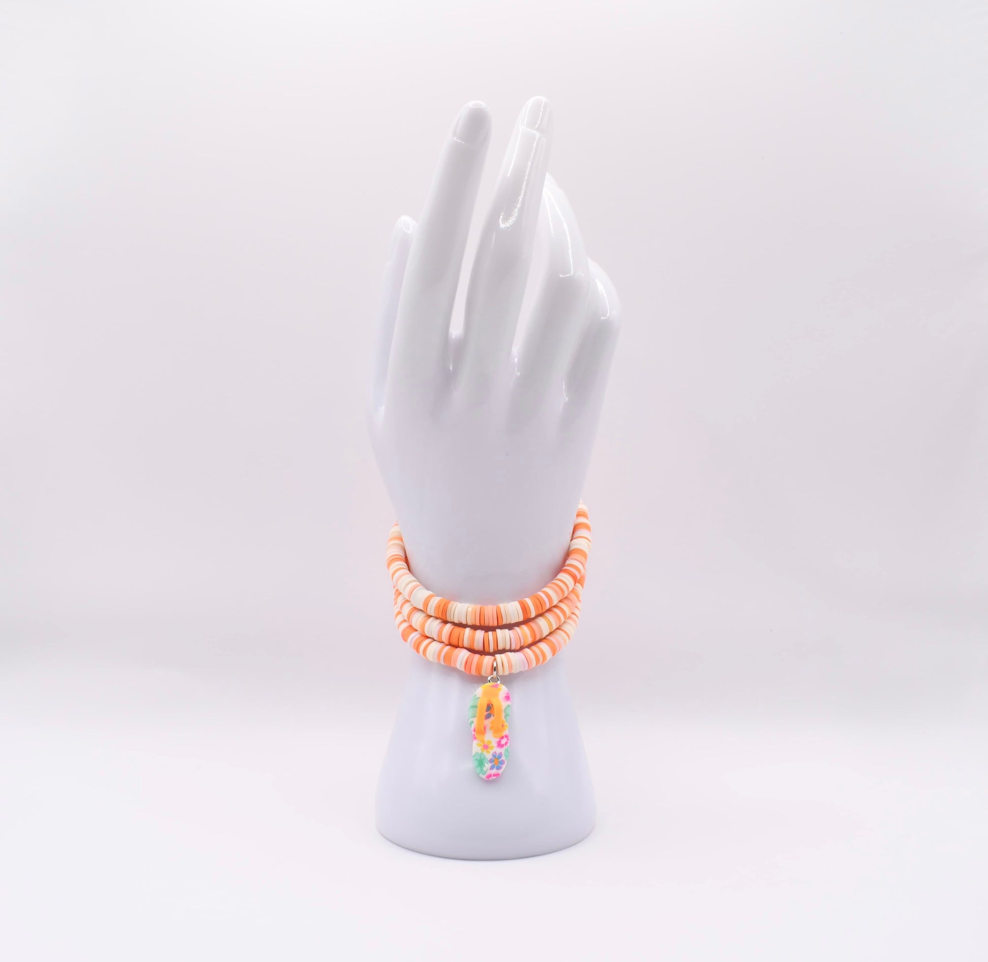 Bring the beach day energy everywhere you go with Sunny Sandal. Stacked in warm sherbet shades of orange, peach, and cream, this bracelet is full of sunshine vibes. Finished with a floral flip-flop charm, it’s the perfect reminder of salty air, tan lines, and carefree summer days.