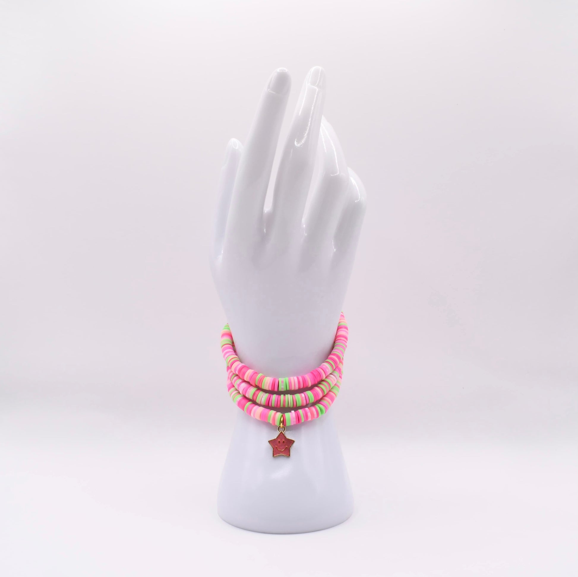 A pop of glossy pink and glitter glow, made to stand out in the cutest way. This bracelet features a smiling star charm that shines with playful confidence — bold, sweet, and a little bit glamorous. Wear it when you’re glowing, laughing, and living like the sparkle is just naturally yours.